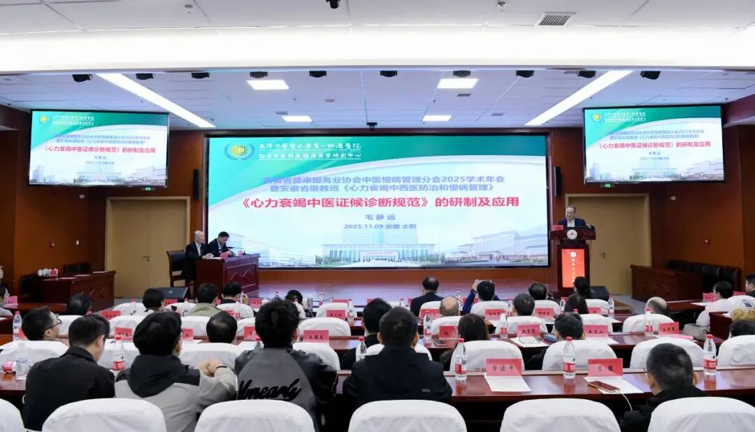 11月9日,安徽省健康服务业协会中医慢病管理分会2025学术年会暨安徽省继续医学教育项目《心力衰竭中西医防治和慢病管理》学习班在太和县中医院急诊综合楼五楼学术报告厅举办。众多国内中医慢病管理和心血管领域权威专家,以及全省多家中医医疗机构医务人员齐聚,共探前沿话题。 全国名中医、天津中医药大学第一附属医院原院长毛静远教授,安徽中医药大学第一附属医院戴小华教授,中国科学技术大学附属第一医院(安徽省立医院)胡立群教授,天津中医药大学第一附属医院王贤良教授,安徽中医药大学第一附属医院邵正斌教授,阜阳市人民医院刘伟教授,太和县卫健委党组成员、疾控中心主任张伟华,安徽省健康服务业协会中医慢病管理分会会长、太和县中医院院长班文明,太和县中医院党委委员、副院长陈光瑞教授,太和县中医院心病一科主任倪代梅教授等参加会议。