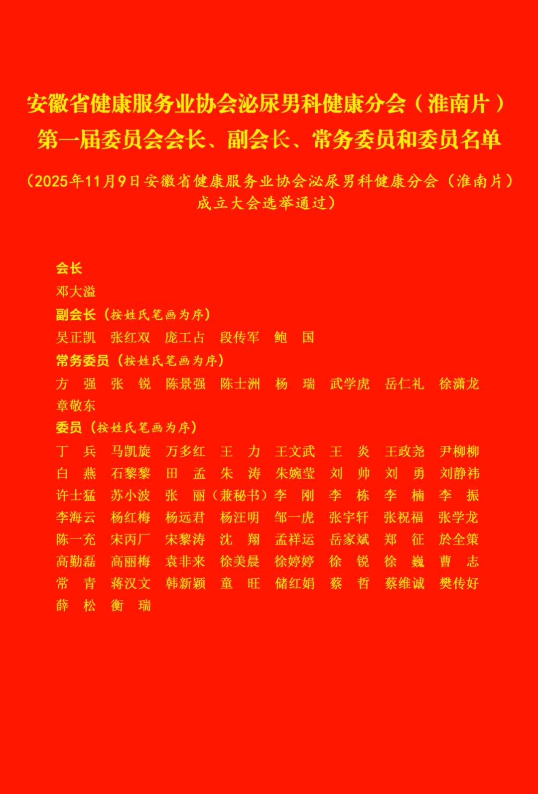 △安徽省健康服务业协会泌尿男科健康分会(淮南片)第一届会长、副会长、常务委员、委员名单 |