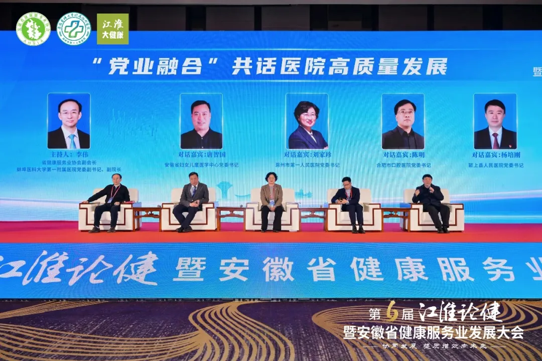 “党业融合”共话医院高质量发展健康对话由协会副会长、蚌埠医科大学第一附属医院党委副书记、副院长李伟主持。对话环节特邀安徽省妇女儿童医学中心党委书记唐智国、滁州市第一人民医院党委书记刘家珍、合肥市口腔医院党委书记陈明、颍上县人民医院党委书记杨培刚进行对话探讨。对话从党建引领学科建设、服务提质、人才培养、资源下沉等角度,深入剖析党建对医院发展的赋能作用,探索党业深度融合的创新路径与实践模式,助力医院实现高质量跨越式发展。