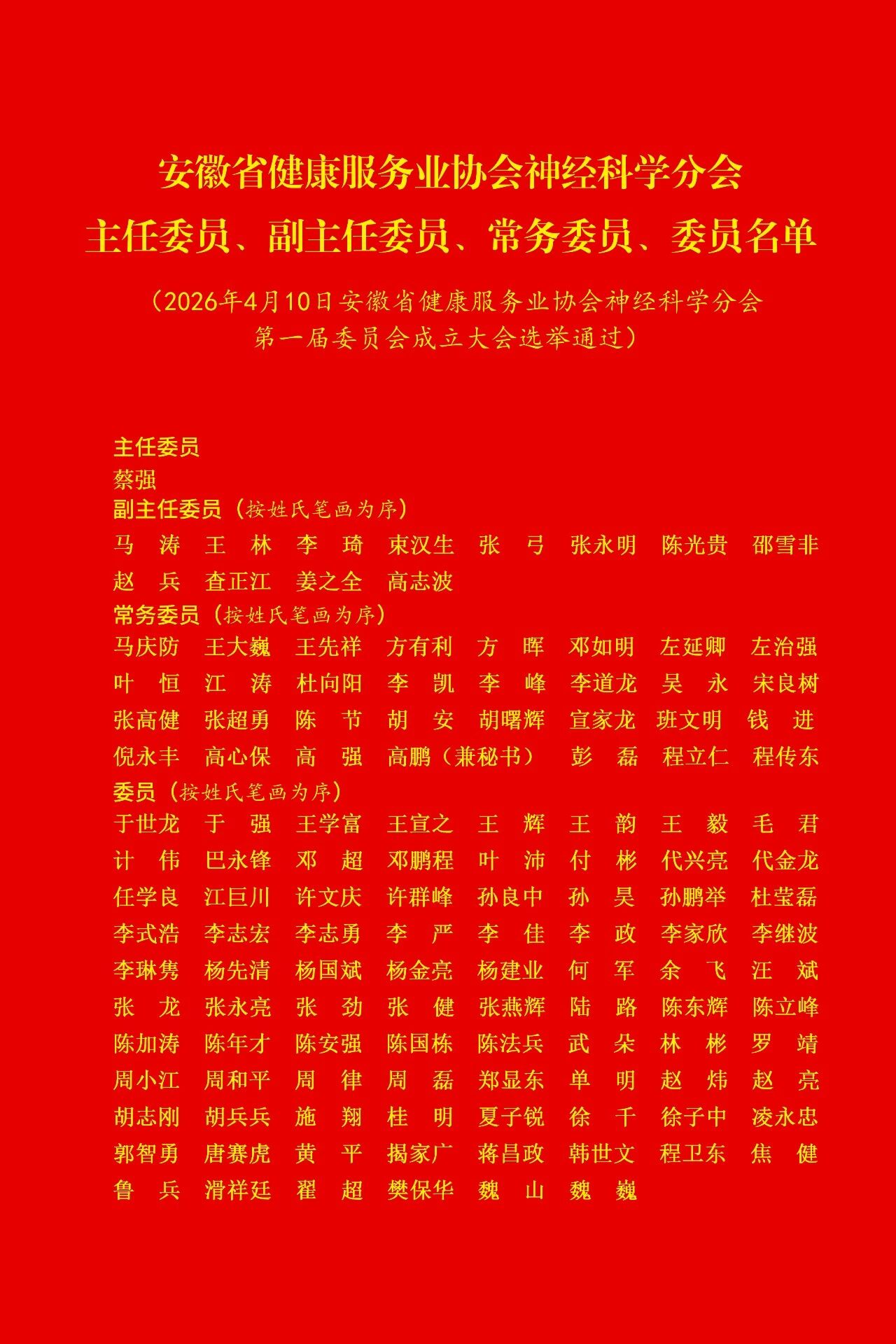 △安徽省健康服务业协会神经科学分会第一届主任委员、副主任委员、常务委员、委员名单